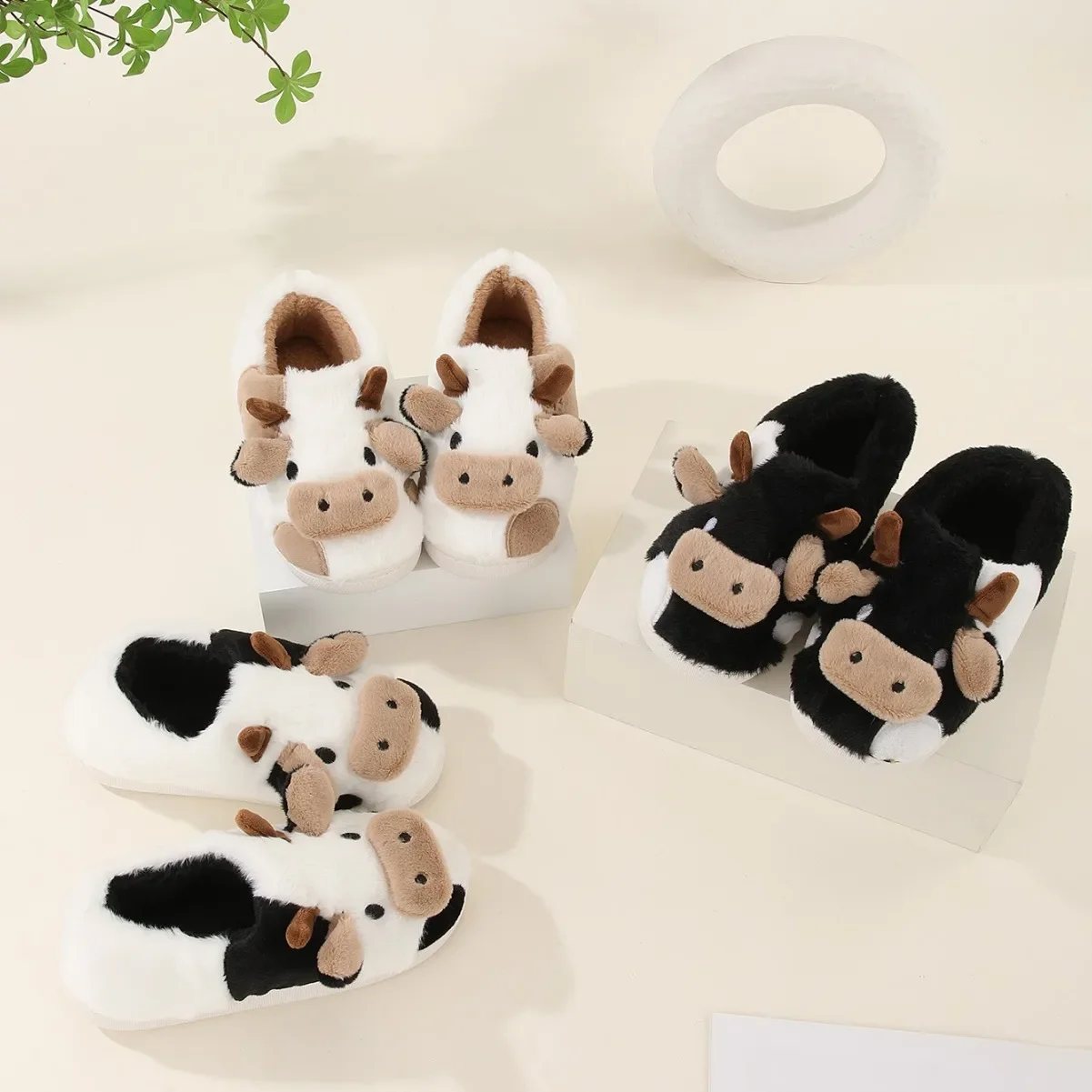 Winter Home Slippers for Couples Warm Plush Neutral Cartoon Cow Indoor Anti Slip Comfortable Cotton Slippers for Men and Women